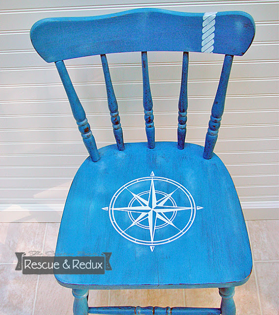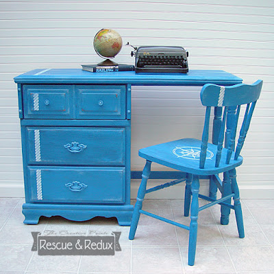 The desk and chair were painted using Americana Decor Chalky Finish in Legacy and then lightly distressed. I felt it needed a nautical theme so I created the rope and compass stencils using the SCAL software program. I cut the stencils from vinyl and painted them on using Everlasting . I actually had some issues with the rope detail on top of the desk and ended up sanding it off and painting it back on by hand. I think it turned out okay! After drying overnight, I lightly sanded the roping to give it a worn look. Next the pieces got a coat of clear wax. Finally, I lightly white washed both pieces with white wax.