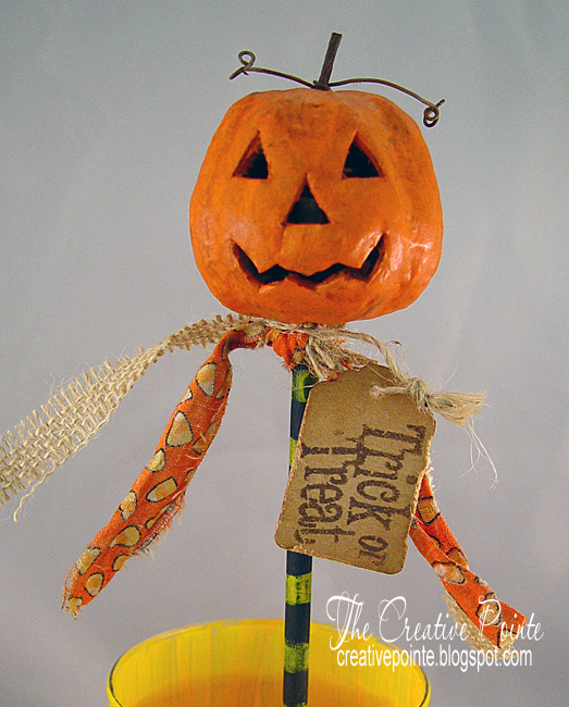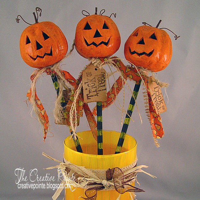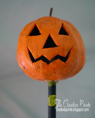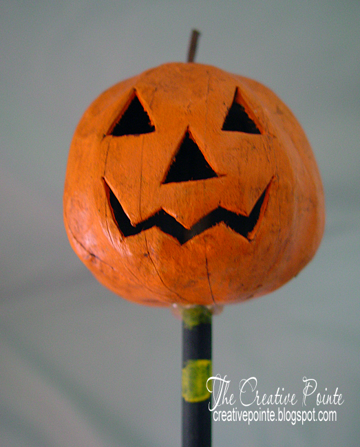 I found these cute little paper mache Jack 'O Lanterns at JoAnn Fabric. I had 12-inch thin dowels on hand so I decided to create vintage style "Jacks on a Stick". Follow these instructions and make some of your own.