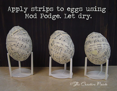 Cover the plastic egg and backs of the paper strips with Mod Podge. Apply strips all over the egg. You'll probably need to go over spot or two as they dry. Make sure no hint of the plastic egg underneath shows. Once the entire egg was covered, I added a final coat of MP all around. I found using my fingers was the easiest way to apply the MP. Pizza stands work perfectly for drying racks.