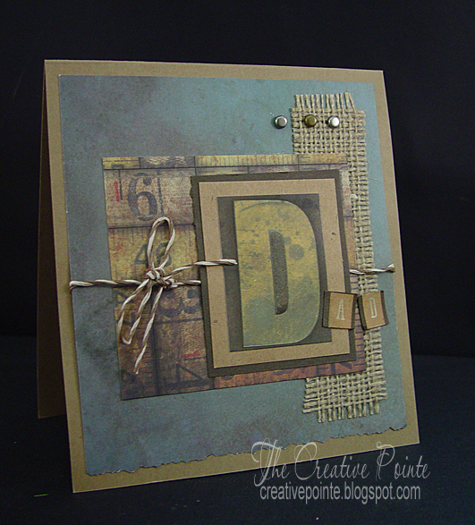 I used several scrap pieces of Tim Holtz paper, for a nice grungy look on the kraft card stock base. Deckle scissors created an uneven bottom to my main piece. Texture was added with a scrap of burlap, brown & white twine and three metal brads. The large letter "D" also came from Tim Holtz (sticker pack). I matted it using several coordinating shades of plain cardstock. The small "A" and "D" letters were kraft stickers that I matted and added.