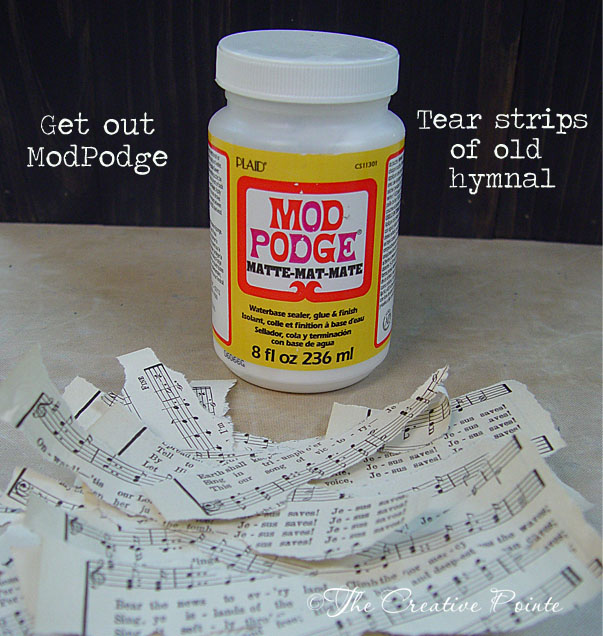 You'll also need regular Mod Podge (matte or glossy) and an old book or hymnal that you can tear pages out of. I ripped them into strips first but ended up using half or third strips to be able to lay them with the least amount of wrinkles.