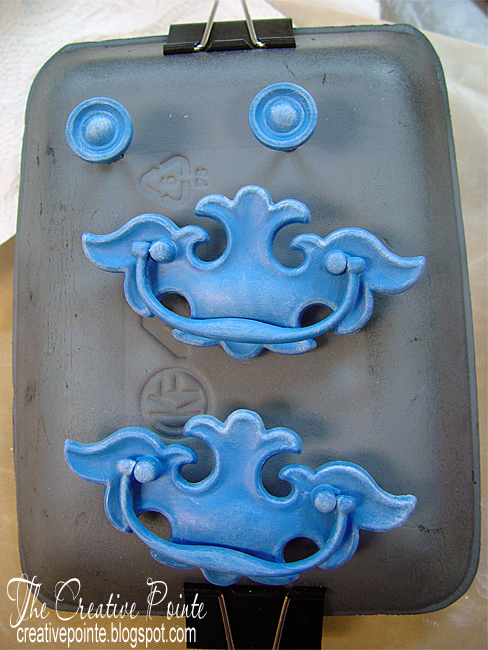I add bulldog clips to the sides of the tray, run a dowel through the handles and prop up on stacked paint tubs. This allows the handles of the pulls to continue to hang straight down, drying both sides at the same time. Once the primer is dry, I continue to use the tray to hold the hardware while I paint and wax or varnish, continuing to hang upside down until the final coat is dry.
